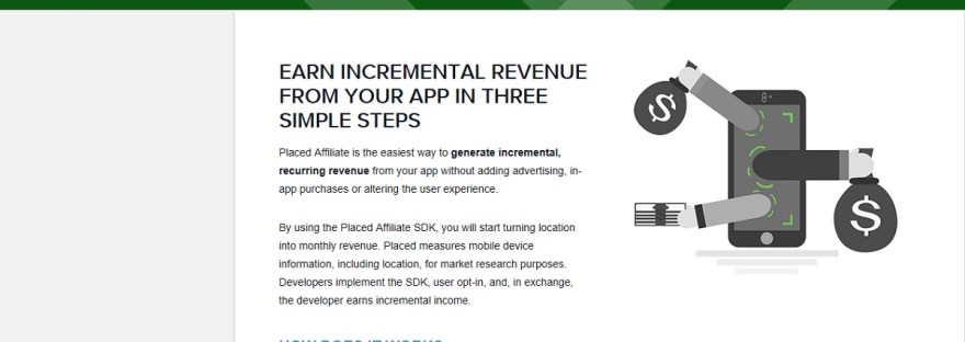 Placed is an affiliate company that offers apps developers a chance to earn incremental revenue from their apps. The company gives app developers a way to generate recurring income without using advertising, in-app purchases or altering the user experience.
